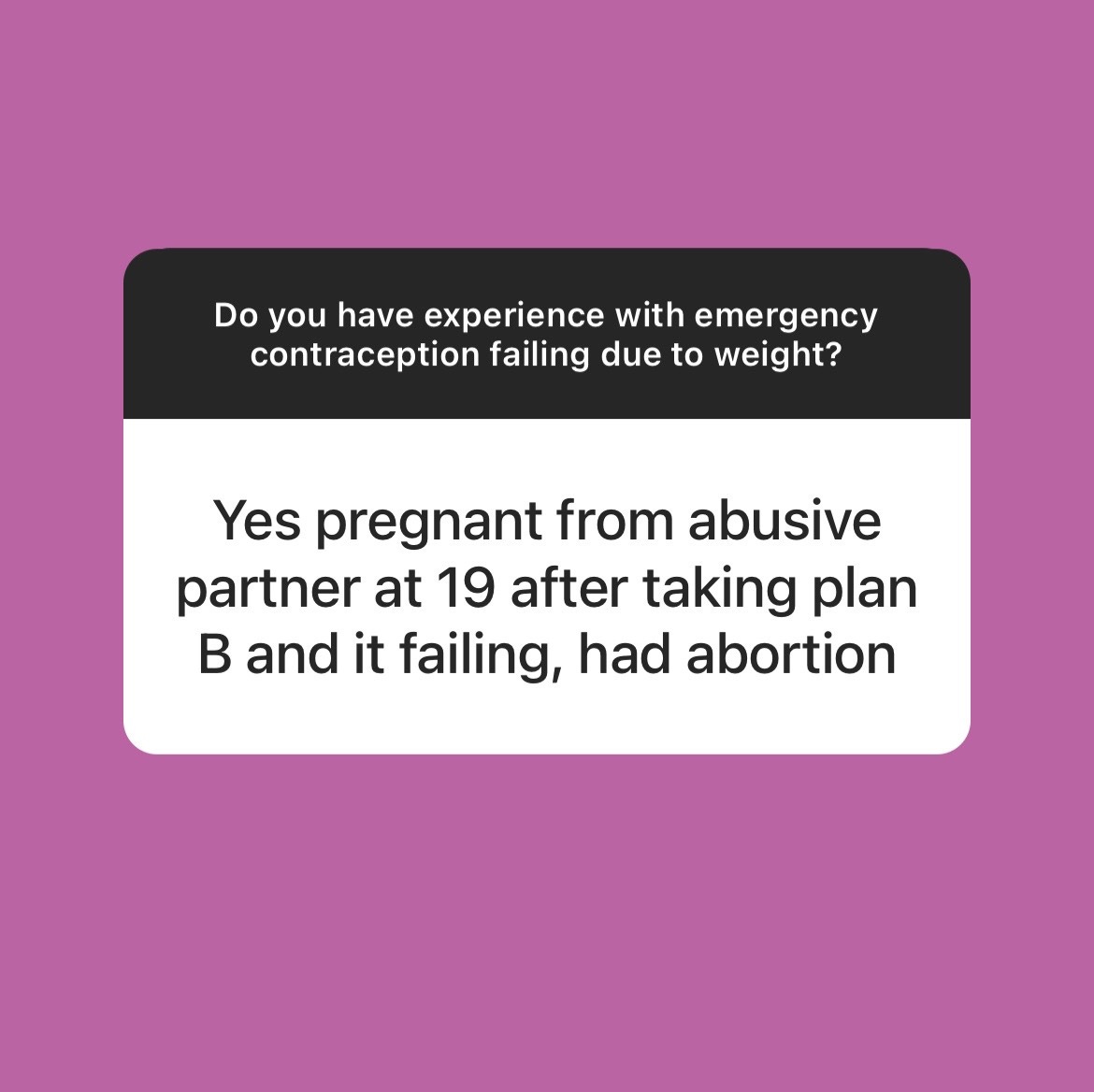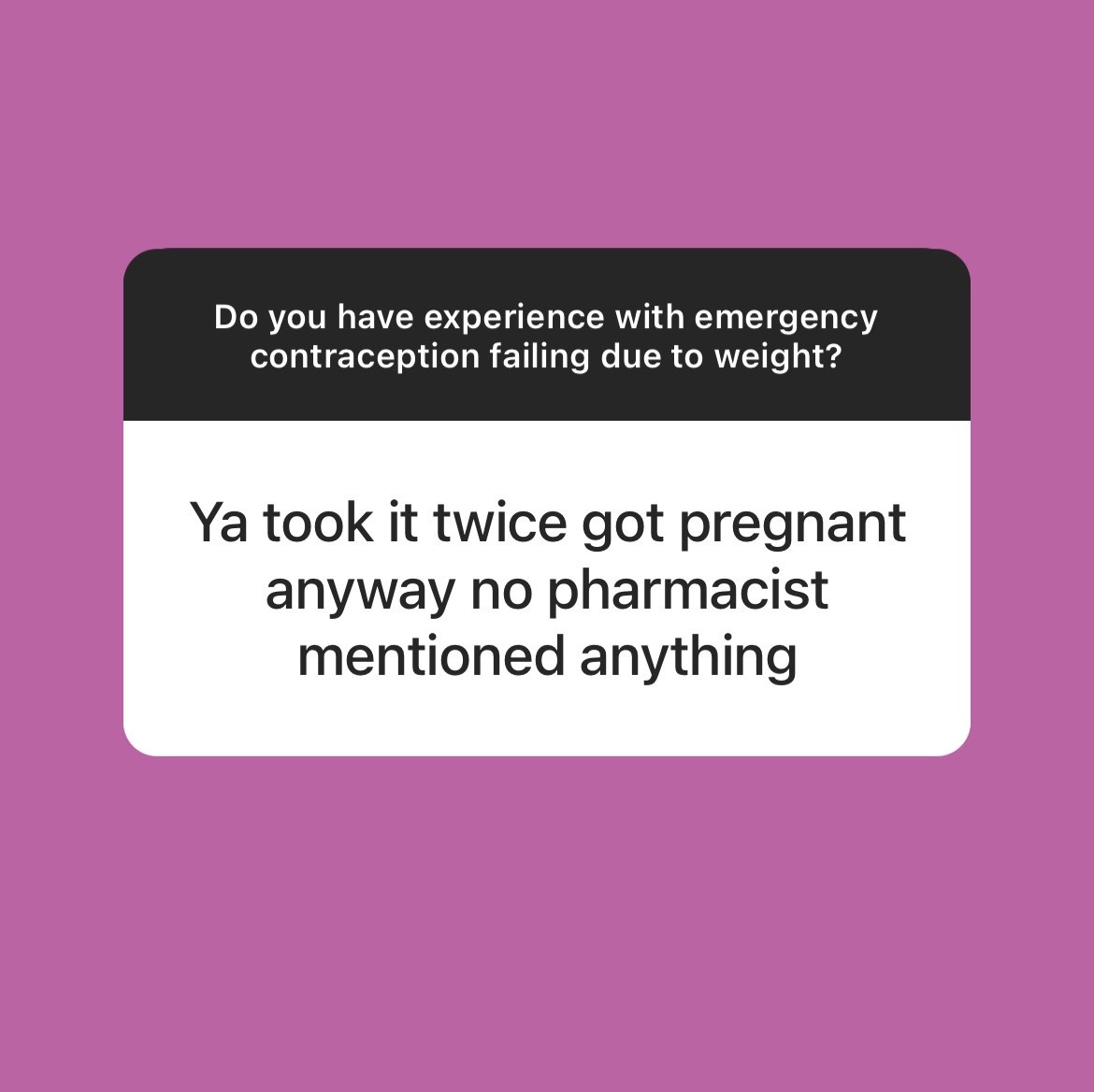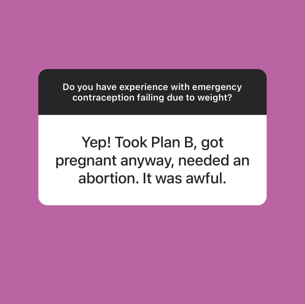 When I polled my Instagram followers last week, almost 40 percent of them said they had no idea that Plan B doesn’t work as well for fat folks.1 And those that knew often found out the hard way, like Grace. “I got pregnant at 19, from an abusive partner,” wrote one. “Plan B failed. I had an abortion.” Others told me stories of supporting family members through post-Plan B abortions, or of working in healthcare clinics where such stories are commonplace. (The one fun way people have learned this fact: The premiere episode of “Shrill.” Thank you Lindy West and Aidy Bryant, doing the lord’s work!)