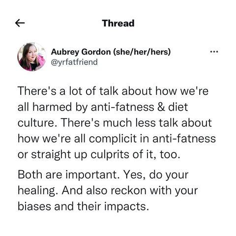 I mean, I think the other thing to know is that there is an eagerness that is part of the galaxy brain thing, it's part of the starting to recognize it everywhere, to label everything as a facet of diet culture. And what I would say is that if there is a bedrock here, the bedrock is not diet culture, the bedrock is anti-fatness. Diet culture does not exist without a profound fear of becoming fat, without a profound fear of being treated the way that fat people are treated. And without what social psychologists call “social distancing”—it's a different kind than the one that we've been talking about.