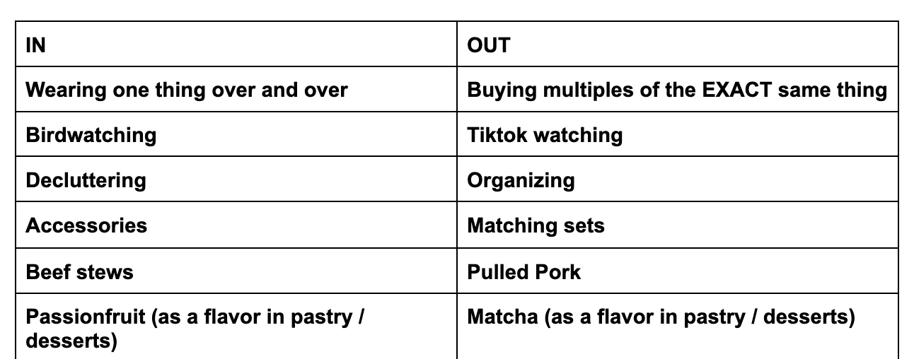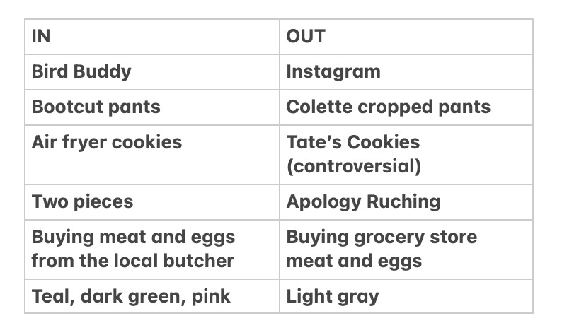 This came onto my radar maybe two years ago. Everyone on Instagram was posting a screenshot of their Notes app, with a list on the left of things that are IN for the coming year. And on the right, a list of things that are OUT.