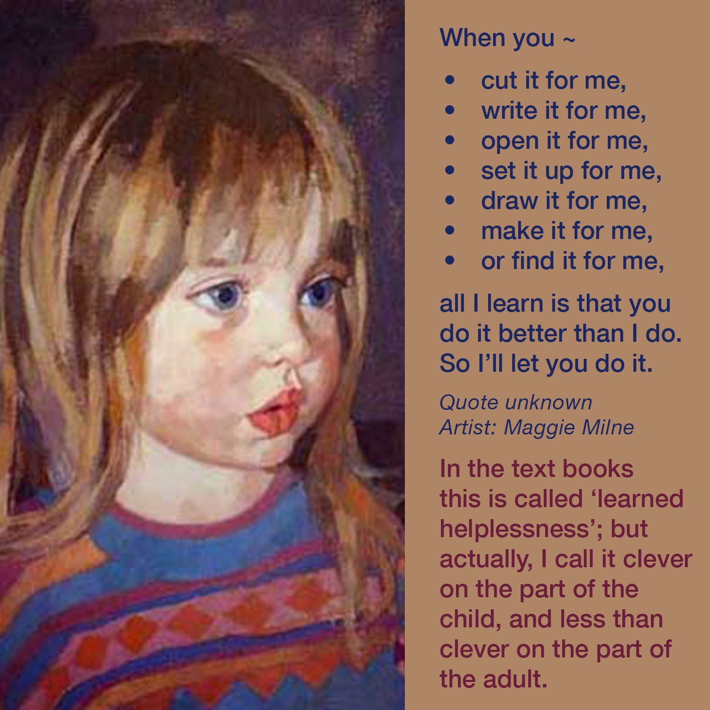 I just want to describe the image because it’s doing a lot of work. It’s a painting of a very cherubic looking three or four year old, whose eyes are just full of innocent wonder and who has like rosy little pursed lips. She just looks like a blank canvas that you as the parent might be in danger of destroying. So it says, “When you cut it for me, write it for me, open it for me, set it up for me, draw it for me, and make it for me or find it for me. All I learned is that you do it better than I do. So I’ll let you do it. In the textbooks, this is called learned helplessness, but actually I call it clever on the part of the child and less than clever on the part of the adult.”