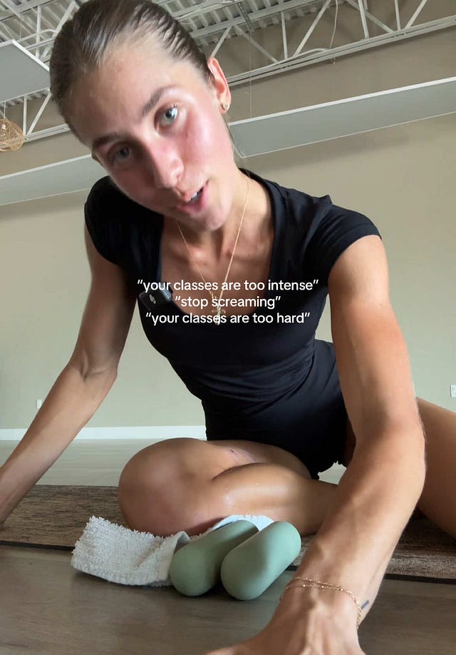 Yes, please don’t come over here with this. So I think it’s a combination of the fact that maybe her workouts feel a little mislabeled to a lot of people who are professionals in the field, and then her teaching style is extremely intense. And that’s really what I would love to get into. Because I think if you’ve been a casual fitness person, you have experienced these type of intense motivational instructors and and maybe when we rewind to when we were the age of the ranter, that would have worked. That does work on a lot of people. What this person is saying is if you don’t like it, don’t come to my class. There are always going to be people who love a punishing, intense type of motivation because they never experienced anything else. They don’t know how to find motivation or how to exercise without the presence of punishment.