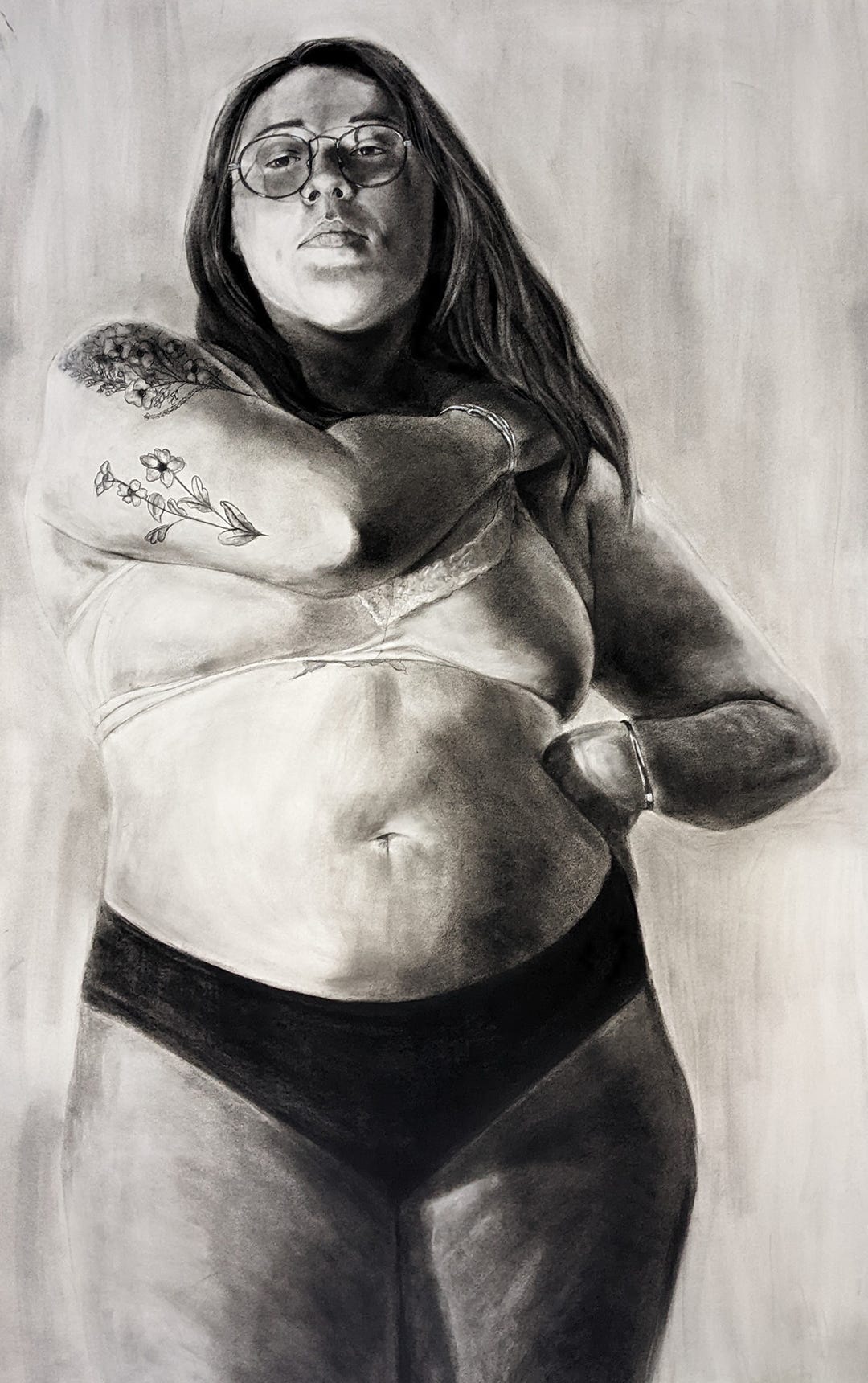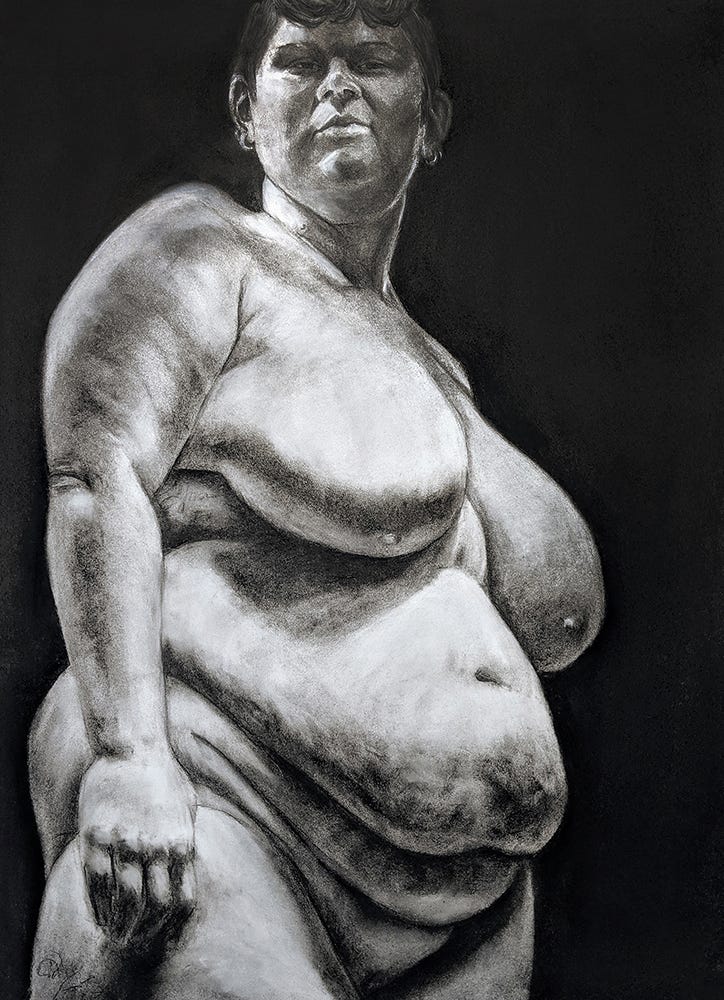 I’ve always been a figurative artist. I love drawing the human figure. So I was like, “You know what, maybe I need to draw myself nude.” I had always been interested in being a nude model. But my body shape wasn’t what people drew when I was a student. So it seemed very cut off to me. One of my friends was like, “Hey, I think you need to draw yourself.” So I drew myself, collarbone to thigh. It actually hangs in my bedroom now, that drawing. And it was difficult, because I was dealing with my own body image issues—but then people were coming into my studio like, “Oh my gosh, like, look at the draping on the stomach from all the weight fluctuations. This is really beautiful. And this is such a great drawing. I love how you’re honoring that body.”
