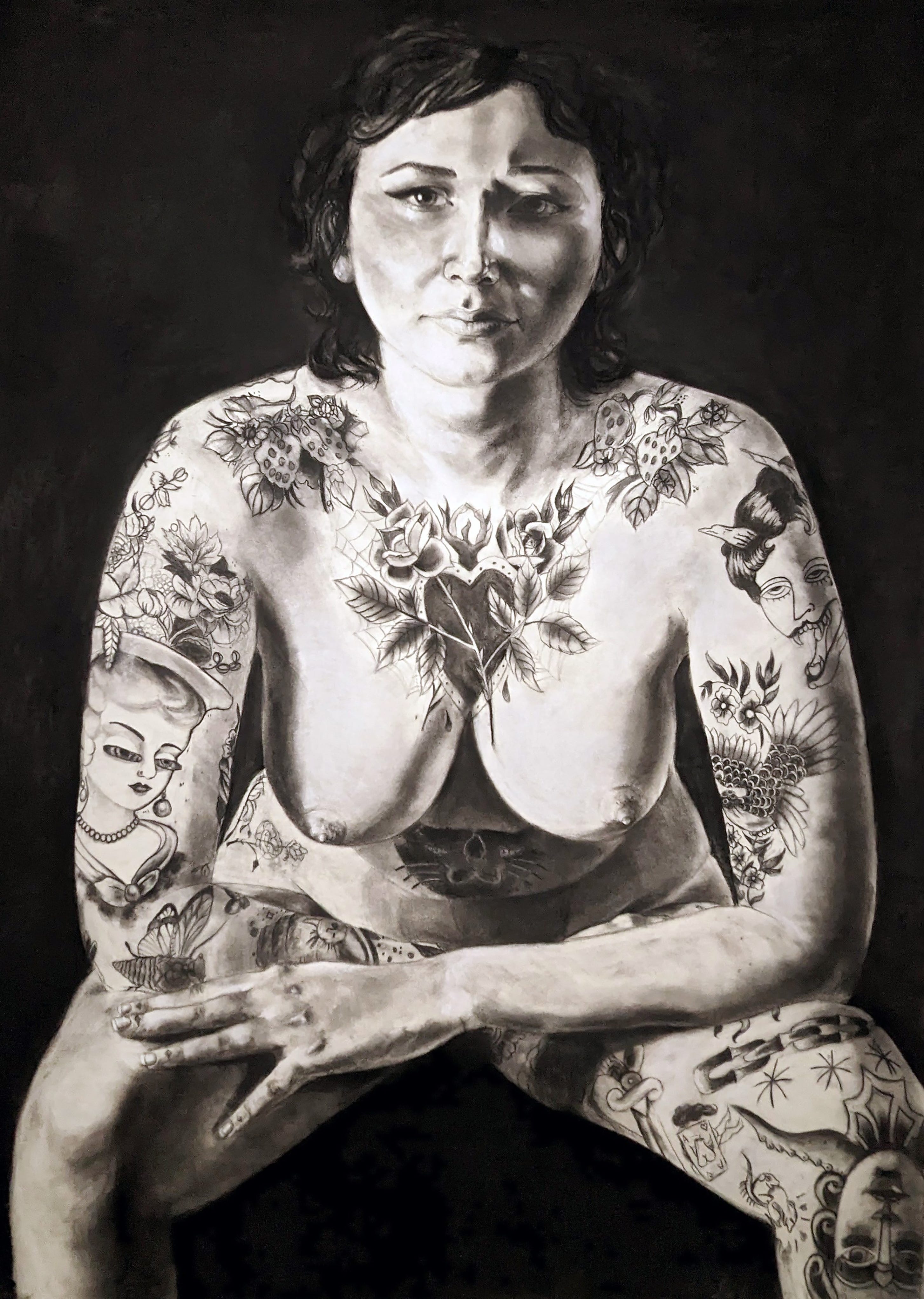 I love it when people bring up the tattoos. My piece “Brazen” is of the woman I mentioned earlier who talked about using her body to reclaim tattoos. I have three drawings of folks who are heavily tattooed. One I just finished this summer [above] and it probably was the most nerve wracking thing for me to figure out artistically. I thought I had it with the first two drawings I did. And then the one I just finished, the title is called “Unwavering” if people want to look it up. She has so many tattoos. Usually I draw the form of the body first, and then I add the tattoos on. I had to draw the tattoos first.