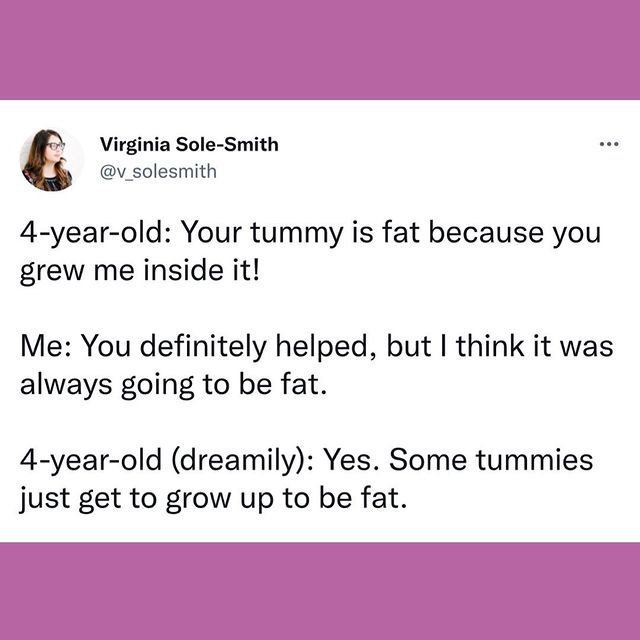 Also, kids’ ways of commenting are so specific. I love that the four year old is like, “your legs are really big.” That is such a kid way to put it. I'm glad the neighbor was fine with it, it seems. But I totally get as a parent, you're like, I don't even know what to do with that. It is tricky. And you want to make space for people's boundaries around talking about their bodies are really important to respect. And I think you can totally do that while framing fat as a positive thing.