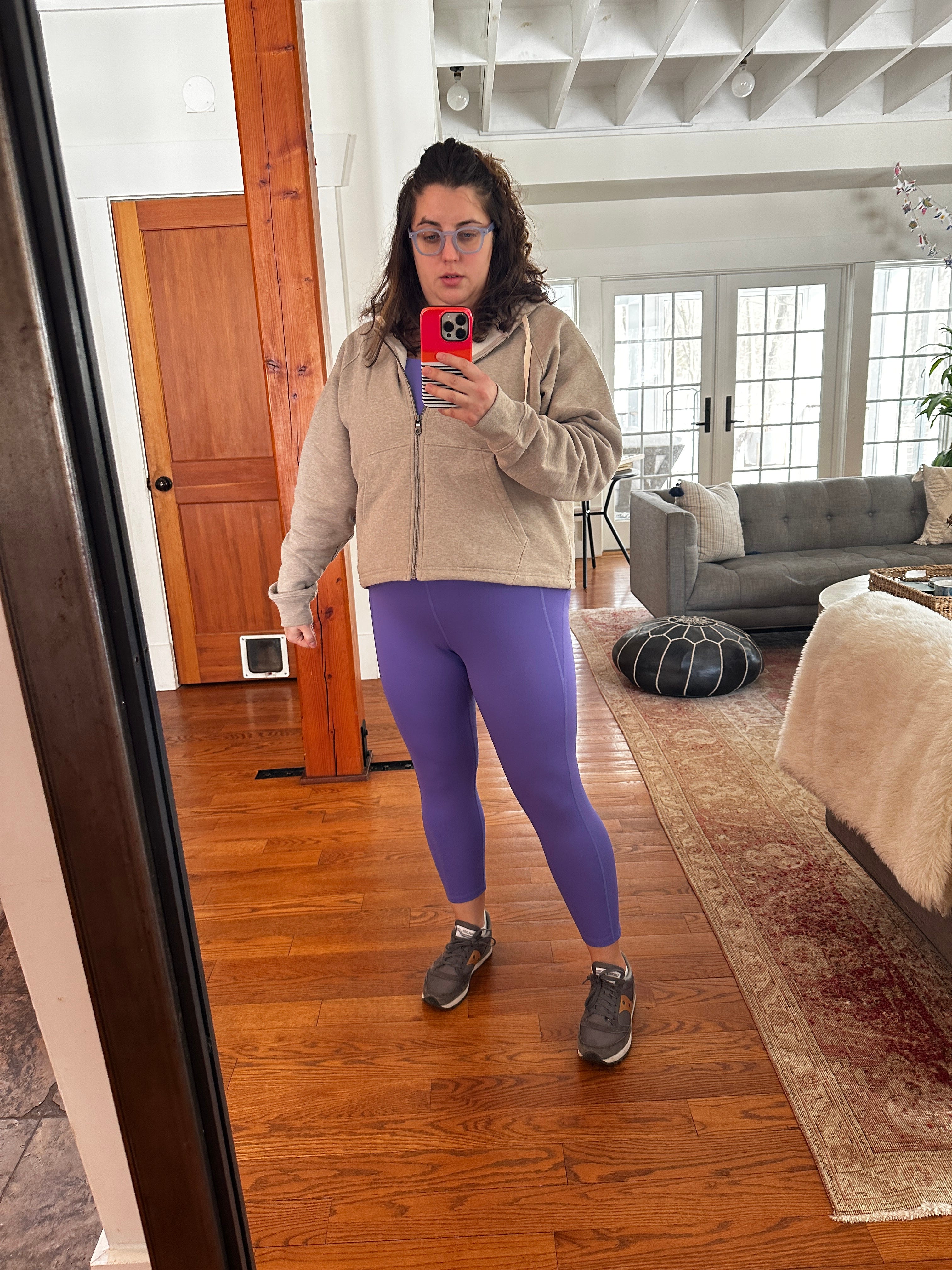 Now, I will tell you, when I said that on Instagram, I immediately heard from a bunch of people who said they fall down. Because that's how clothes work. Like, I can't guarantee this. I did hear from a lot of hourglass shaped people saying this. So maybe the fit model may be more of an apple, for lack of a better word, shape. So if that is your struggle—and it's not a struggle, our bodies are great. But if clothes that fit that shape is your struggle, then this might be a good brand for you. They're super comfortable, they do not fall down. They really hold their shape, no saggy knees, etc. The fabric is very thick. At first I was like, will these move with me? Like, it's dense. But I actually really like it and it's probably more athletic feeling. I don't think these are a dressy legging.