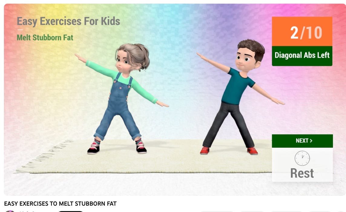 The first search result is a fairly boring “Get Fast” kids workout. It isn’t diet culture per se, but I do have questions about why the mom making this channel shoots her son doing basketball drills in gym shorts, and then shoots her daughter doing a very pink Barbie-inspired workout designed to give her “high heel feet.”