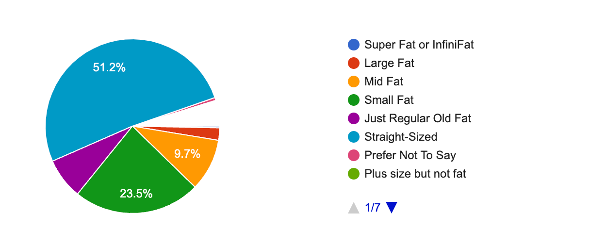 Over 65 percent of you are parents, step-parents, grandparents, or another form of caregiver, and the ages of the kids you’re raising run the full gamut. (So yes, more teen-focused content is on my to do list!) One interesting twist: 71 percent of you said your kids are straight-sized. A common misconception of my work is that it’s only for the parents of fat kids. Some folks at my publisher even worried that calling the book FAT TALK would mean parents of thin kids wouldn’t buy it. So I love seeing how clearly that is not the case—but again, this also means we’re holding a lot of different needs together in this space. Parents of fat kids are facing a different kind of hell in terms of judgment and stigma and need extra support keeping their kids safe. Thin kids need body autonomy too. But they also need to learn about thin privilege and how to avoid weaponizing it.