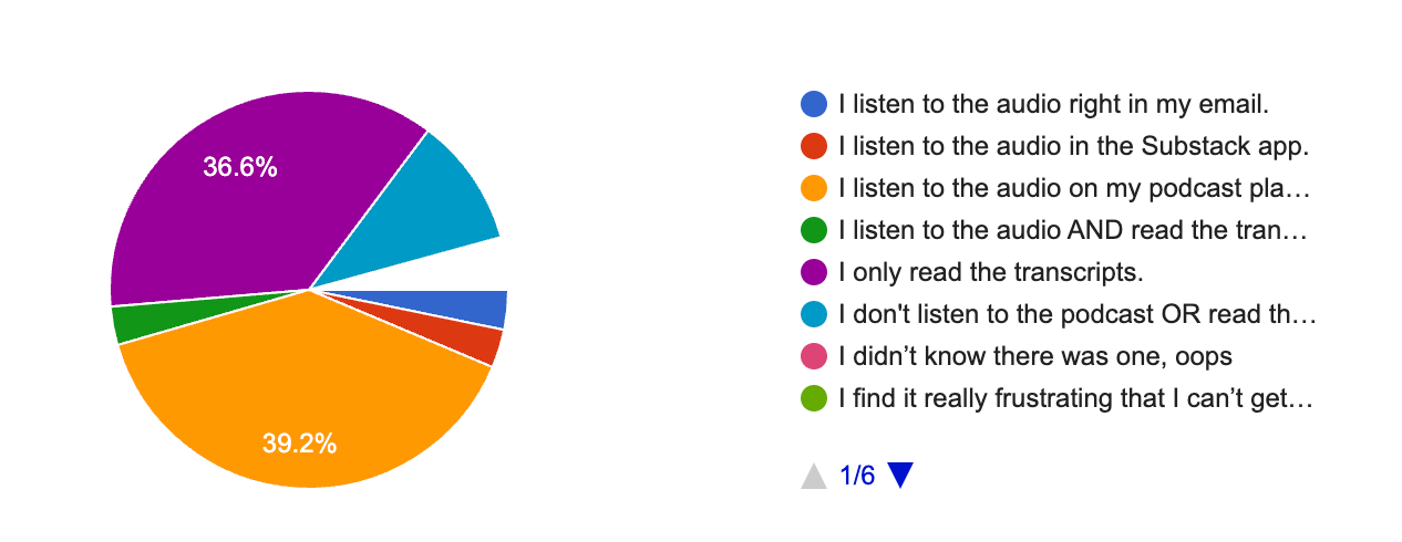 One big change I’m proud of: Last year, 60 percent of you said you only read the podcast transcripts and never listened to the audio. This year, only 36.5 percent of you said that! And almost 50 percent of you are listening one way or another (we’re in your email, in the Substack app, and also on Apple Podcasts, Spotify, Stitcher, and Pocket Casts).