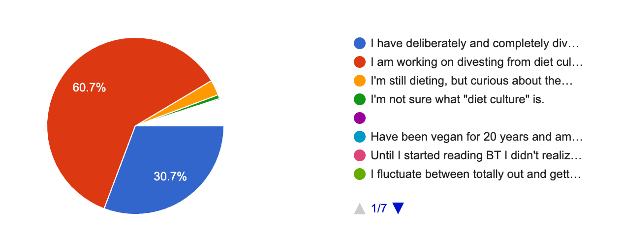 30.7 percent of you said you’ve deliberately and completely divested from diet culture. A (more honest/realistic?) 60.8 percent of you said that you’re working on it. Lots of you talked about navigating diabetes and other medical conditions that make you “diet culture vulnerable,” as one reader put it. Several of you say you’ve never consciously dieted but are now reflecting on how a decade-long commitment to organic food or twenty years of veganism is maybe more rooted in anti-fatness than you thought.