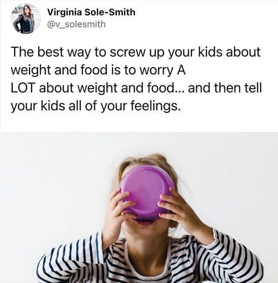 Hi new subscribers! I had the pleasure of speaking with Emily Oster of ParentData about how to think about body changes in kids during the pandemic, and how to talk about food and weight with kids without passing on our issues around diet/food/weight. I know a lot of you are joining me from Emily’s list — welcome, and thank you!