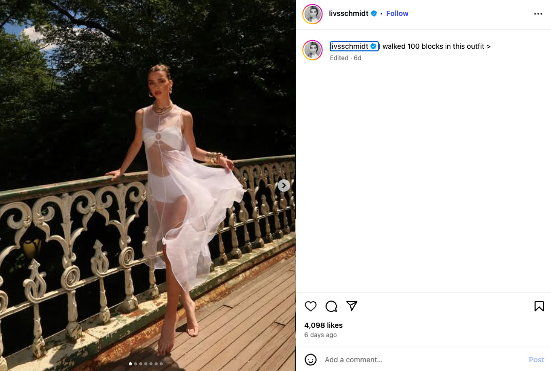 Liv Schmidt is a 23-year-old weight loss influencer/girl about town. Literally about town; most of Schmidt’s Instagram content is photos of her posing in random spots around New York City, or walking obsessively around New York City or both.
