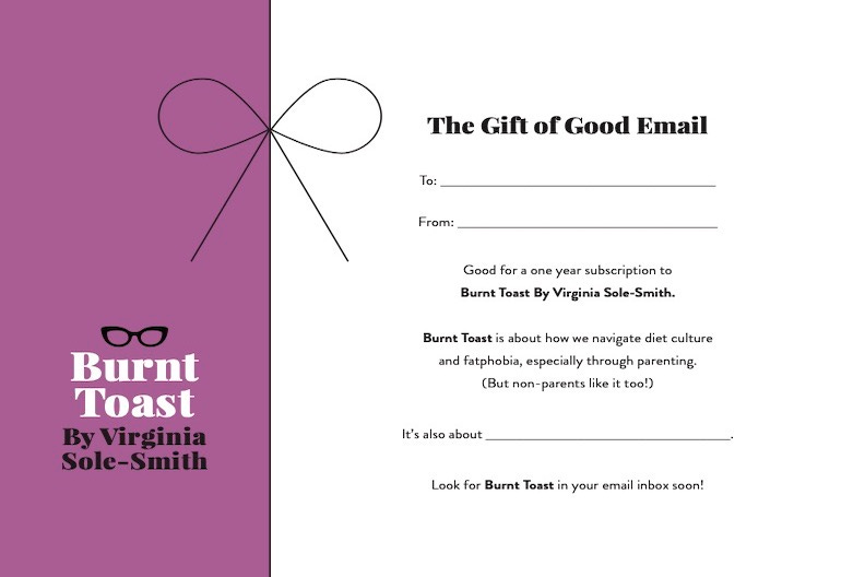 And a subscription to Burnt Toast makes a lovely gift for your slowly radicalizing mother, or the co-worker who is your one ally at the office cupcake-shaming parties, or the spouse/partner/co-parent you feed children with, or the friends on the group chat where you’re already regularly texting a link to something you saw here.
