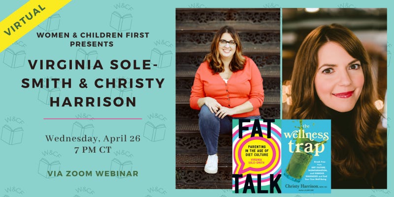 A virtual event! Hosted by Women’s and Children’s First in Chicago; I’ll be in conversation with Christy Harrison, MPH, RD celebrating BOTH of our new books (Rethinking Wellness and Fat Talk also share a birthday! April is an excellent month for books!)