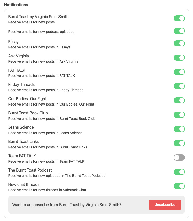 The annoying part: Substack is still working out the kinks on how you do a newsletter-within-a-newsletter, so if you want to join Team FAT TALK, you’ll need to visit your Manage Subscription page (which is accessible via your avatar in the top-right of the screen if you’re reading this in the app or the website). Then scroll down to Notifications and move the toggle for Team FAT TALK to "on.” Here’s a help article if you get stuck, and a maybe useful visual: