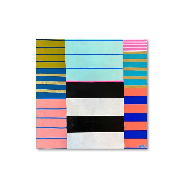 There are several blank walls in my house now, and I’m having so much fun filling them back up— sometimes with giant art, but also with smaller pieces. A new-to-me artist is Katie Craig. I scored this beauty in her Black Friday sale and just hung it up, but she has a million gorgeous paintings, and more budget-friendly prints. I will take all the stripes please!