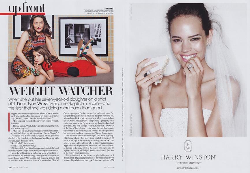 Ten years ago, a writer in New York City named Dara Lynn Weiss became the most maligned mother on the Internet for a minute because she wrote a story for Vogue about putting her then-seven-year-old daughter, Betty Kubovy-Weiss, on a diet. In her subsequent book, The Heavy, Weiss wrote about canceling cupcakes and cooking vegetables without oil to get Betty’s caloric intake down—and about dieting right alongside her child. And she regretted the Vogue photoshoot, not only because it made Betty the face of a national conversation about childhood ob*sity, but also because the photographer chose “flattering poses” for her daughter (lying on her stomach or with a table covering her midsection). Translation: If we could have only seen just how fat Betty was, it would have made everything Weiss did okay.
