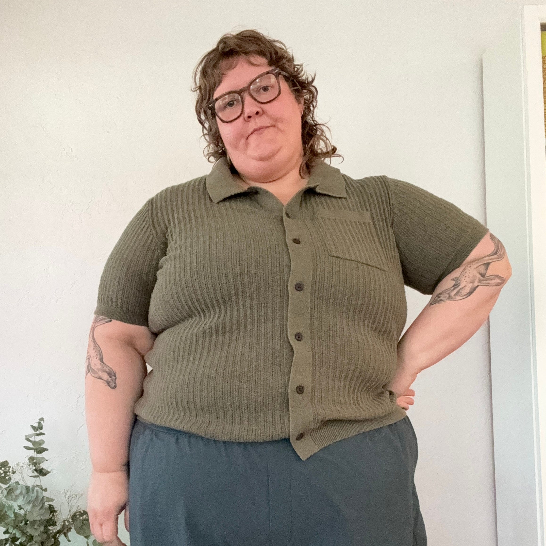 Thank you. I want to endorse knits. Because of the nature of knit fabric, the sizing is a lot more flexible. And also, looking at knits in the men’s department. This is an XXL, which is not my normal size. And also because it’s men’s, it’s longer. I was looking at some sort of button down knit top from Anthropologie that was plus size and like they have a 3x. But I was like, oh, it’s gonna be too short. So yeah, I’m recommending knits in general for fat people and then also looking for them in the men’s section.