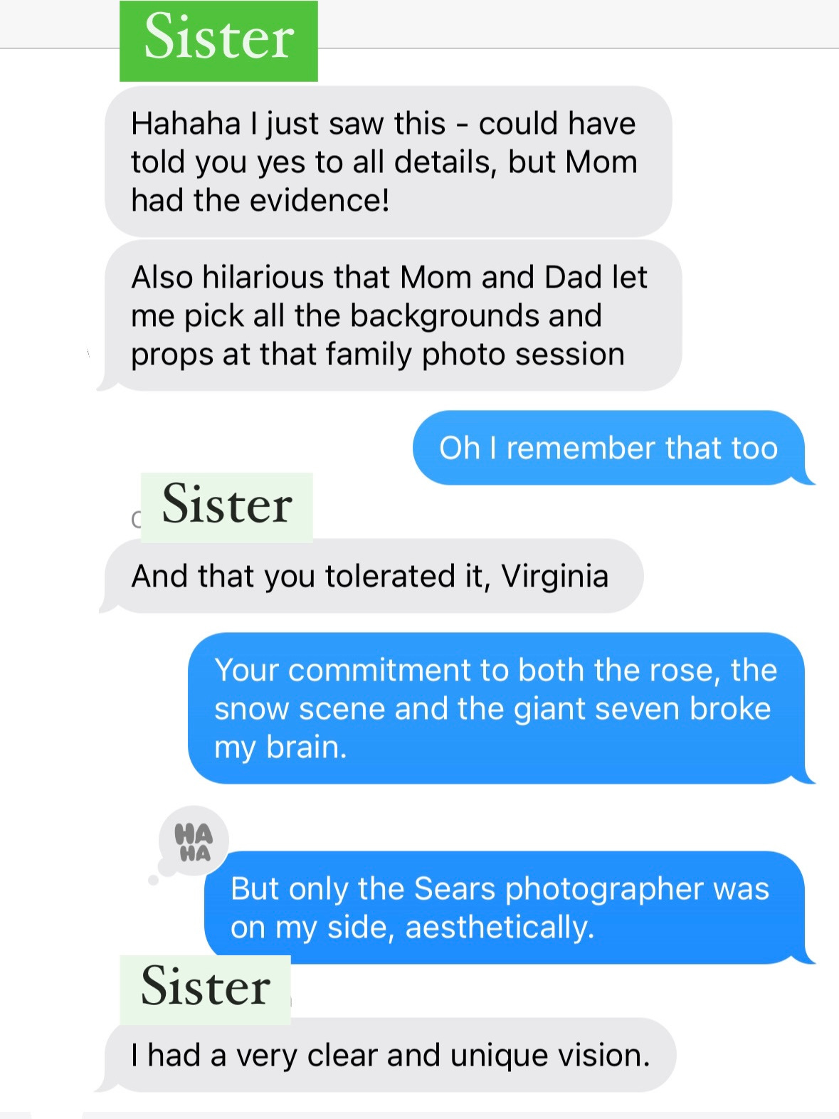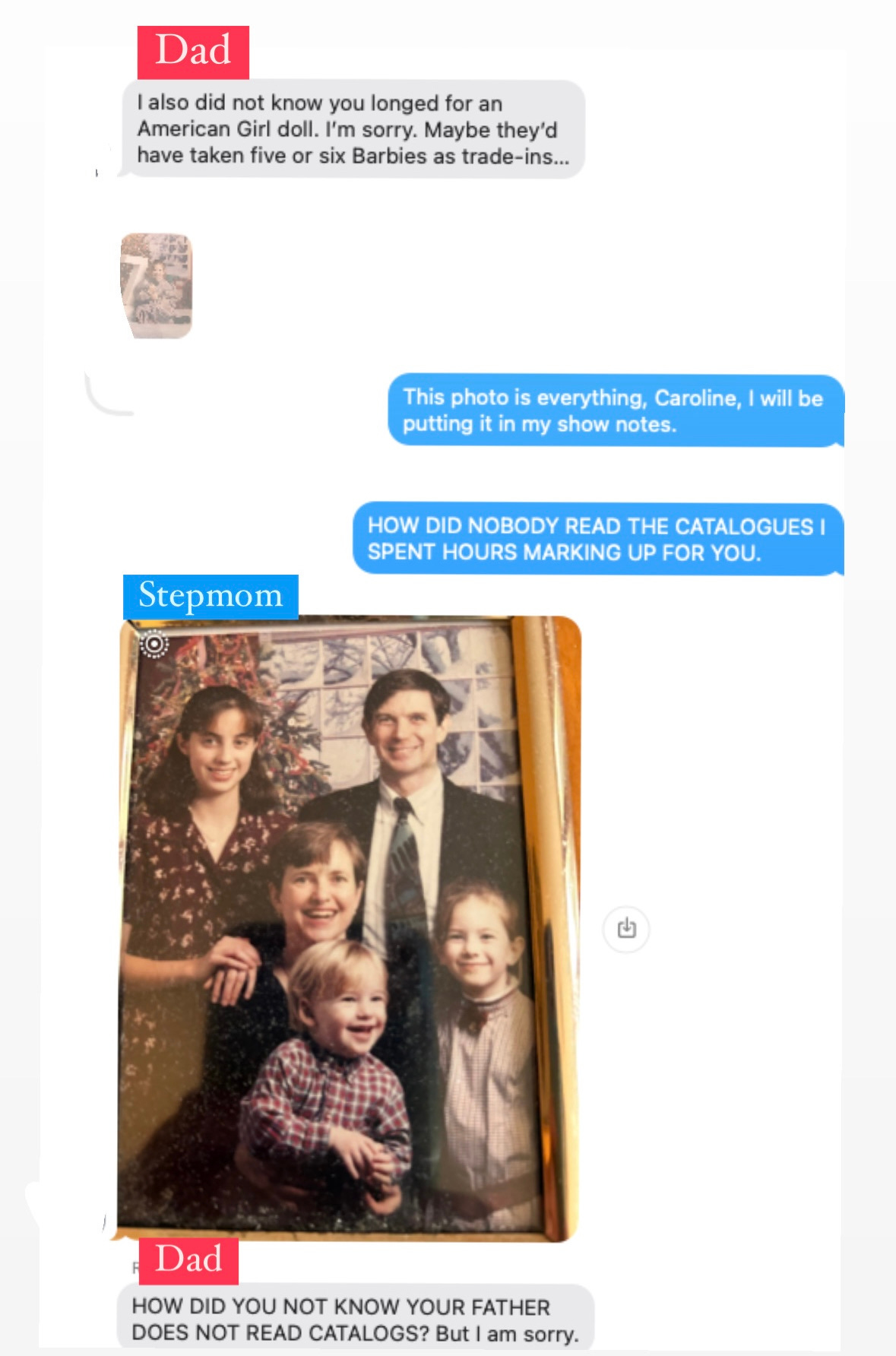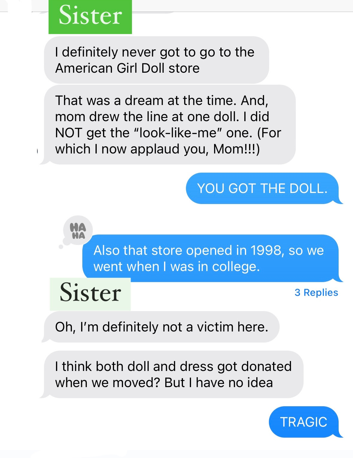 That’s a polite way of phrasing that. It’s really interesting that you have a sibling who’s enough younger than you that you can watch her go through a journey you had already been on, but with a different endpoint you might say. She gets a doll, you don’t and what that felt like for you.