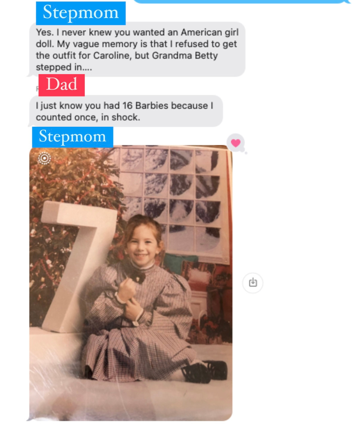 It was a rough moment for us. My family’s financial status had changed so it was possible to give her an American Girl doll. I had all the books, but I never had the dolls. And yes, was a big moment of reckoning for me, because my sister is almost nine years younger than me. It was like, am I going to, as a high school sophomore, take this child’s Samantha doll for my own? Did I think about it? Yes. Did I do it? I did not. Was I mad when she got the Samantha dress?