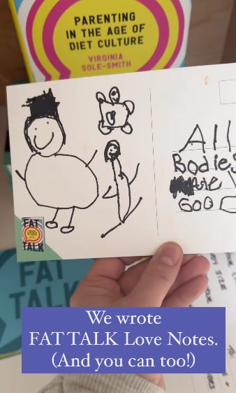 I have a giant stack of FAT TALK post cards that I would LOVE to send out to all of you. We wrote a bunch as a family last weekend and it was so much fun and really helped Beatrix, especially, grasp what the book is about in a way that me just talking hasn’t. If you aren’t sure what you’d do with them, this reel has a few ideas.