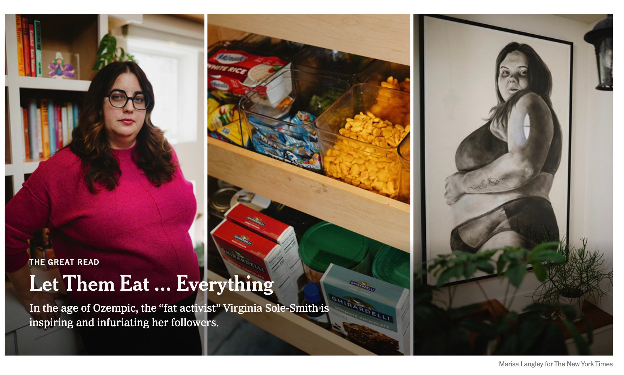 I loved the piece…reading the NYT and running across your article was like running into an old friend in the grocery store. “Oh! I know you!” Damn, though, the comments were a bummer. As a longtime NYT subscriber, I should have expected it. The level of priggish self-congratulation in the comments on anything health related is through the roof. Fatphobe City. Oh, well…screw ‘em. And welcome to the new subscribers!