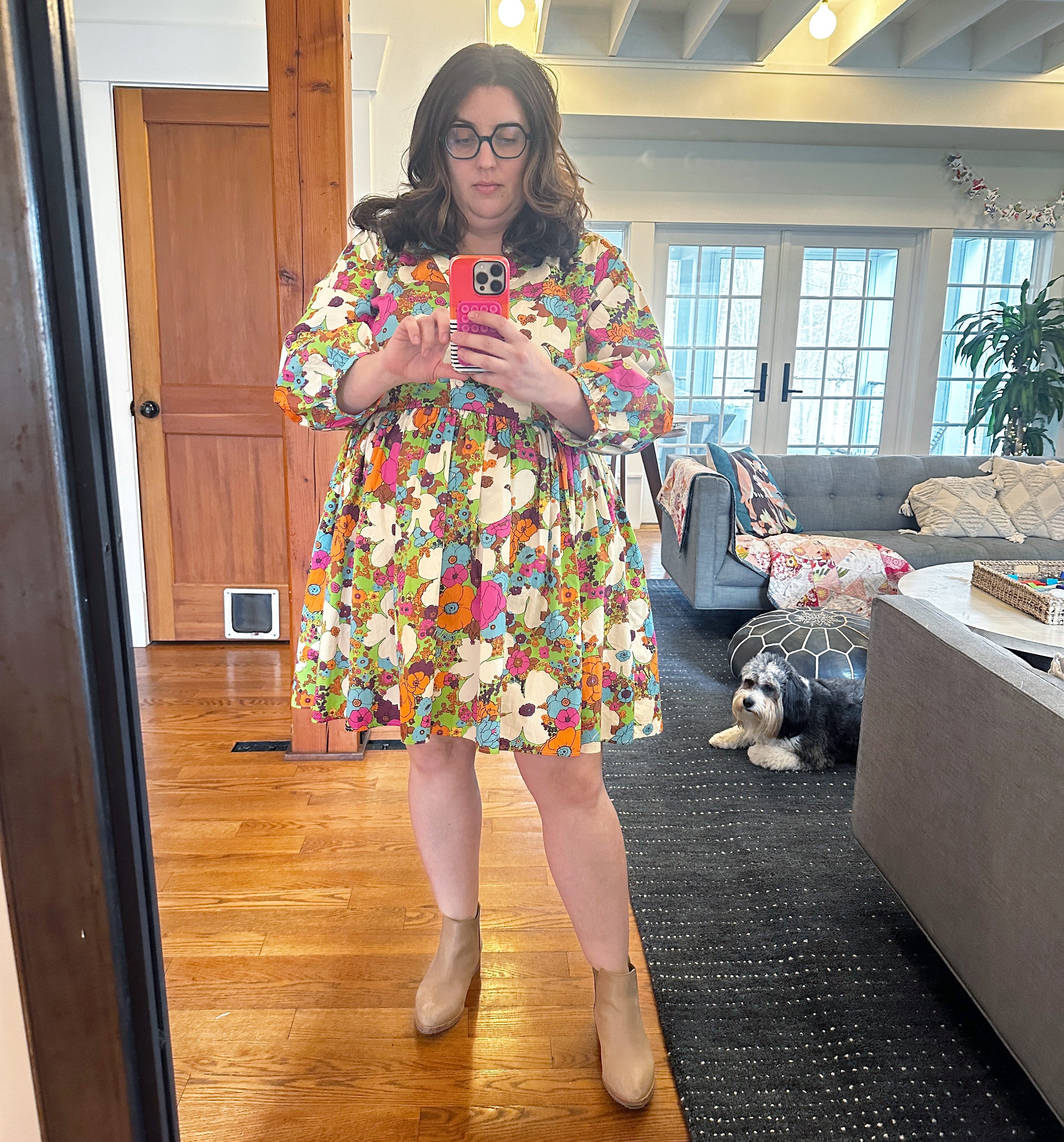 What’s rule challenging about this dress is I will get mistaken for pregnant in it. It hasn’t happened yet, but it will happen because it has this drawstring gather right over the top of your stomach. If you, like me, have not great posture and a belly, it’s going to happen. I have just decided, fuck it. I don’t care. That’s their issue. I really love this dress. It’s super comfy. I could nap in it. And if you are pregnant, this is a great option. It would be nursing friendly.
