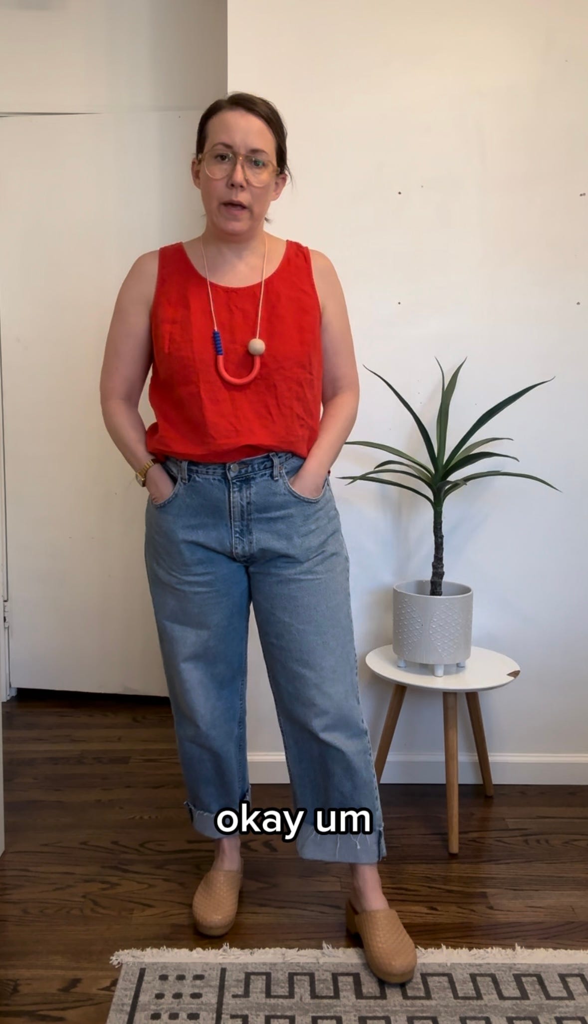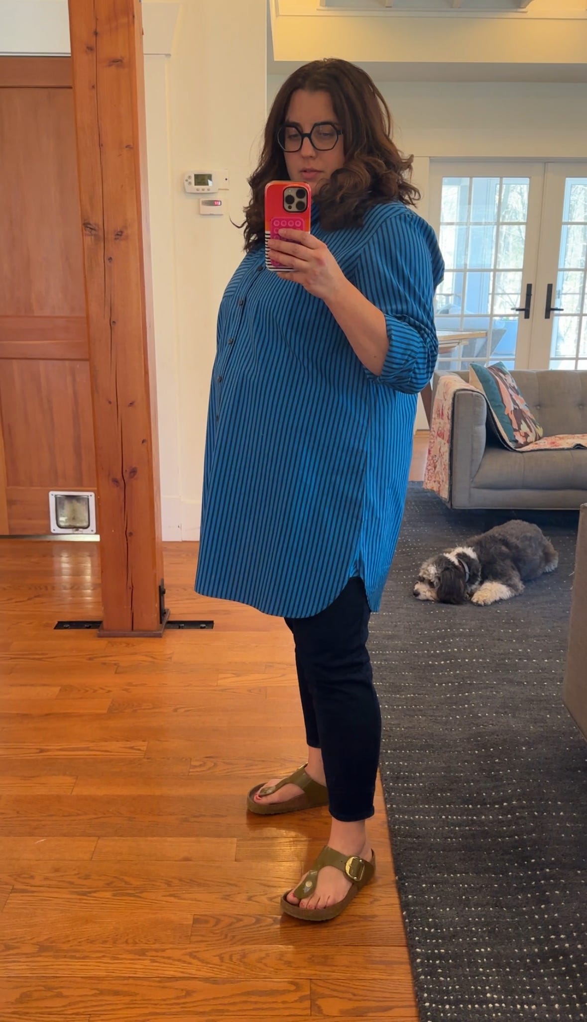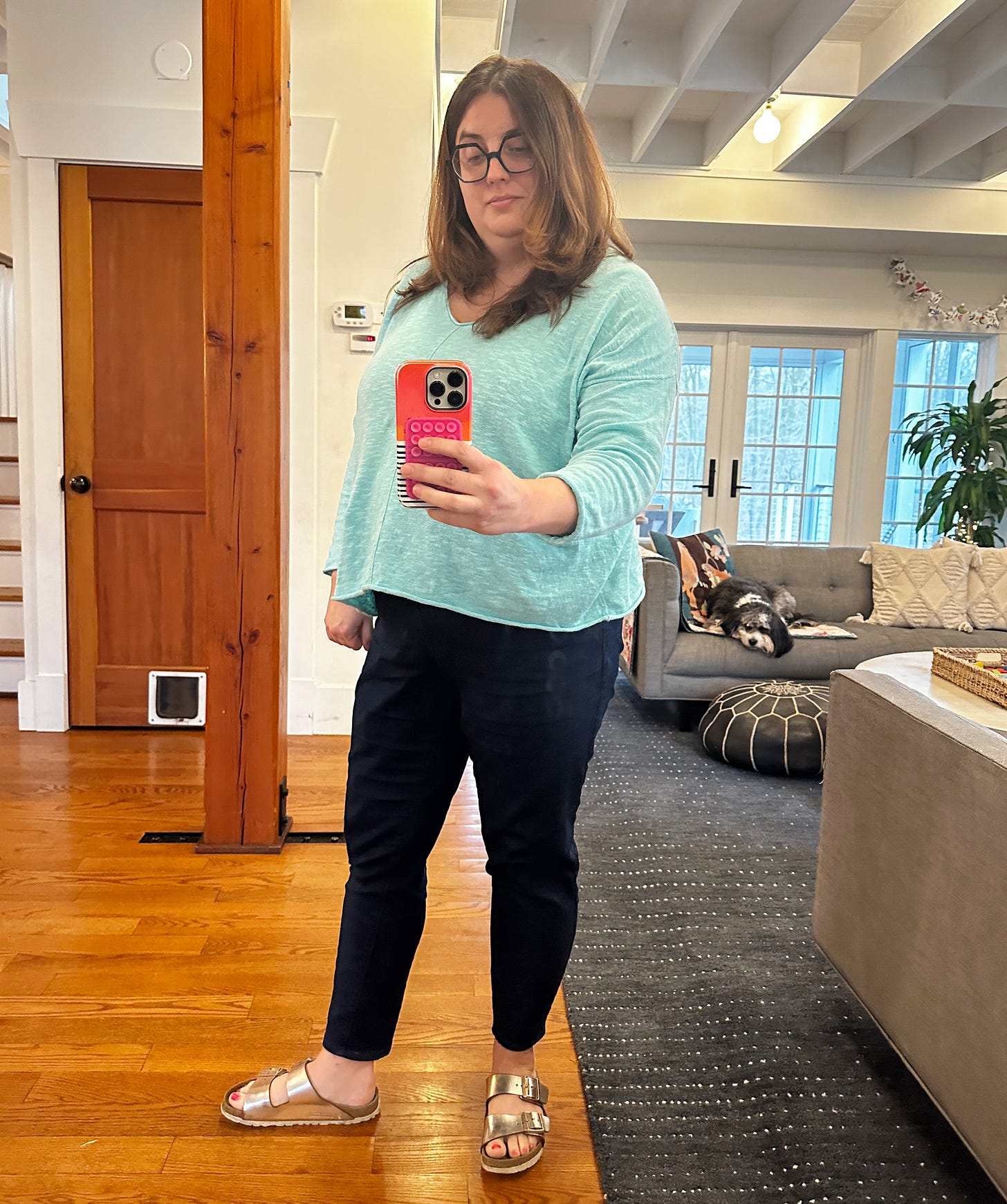I feel like my other big epiphany—Dacy you mentioned wearing more color did help you adjust to wearing more color. I do feel like I am now much more comfortable in straight leg jeans because I wore them pretty diligently every day of the first week and then at least once or twice last week. And I was like, oh yes the volume is turning down on that. That said, my Universal Standard straight leg jeans that I do really like how they look get really baggy and fall off me by like two o’clock. So I did order them in a smaller size. But does that mean I can’t breathe for the first two hours of the day? We’ll see when they arrive.