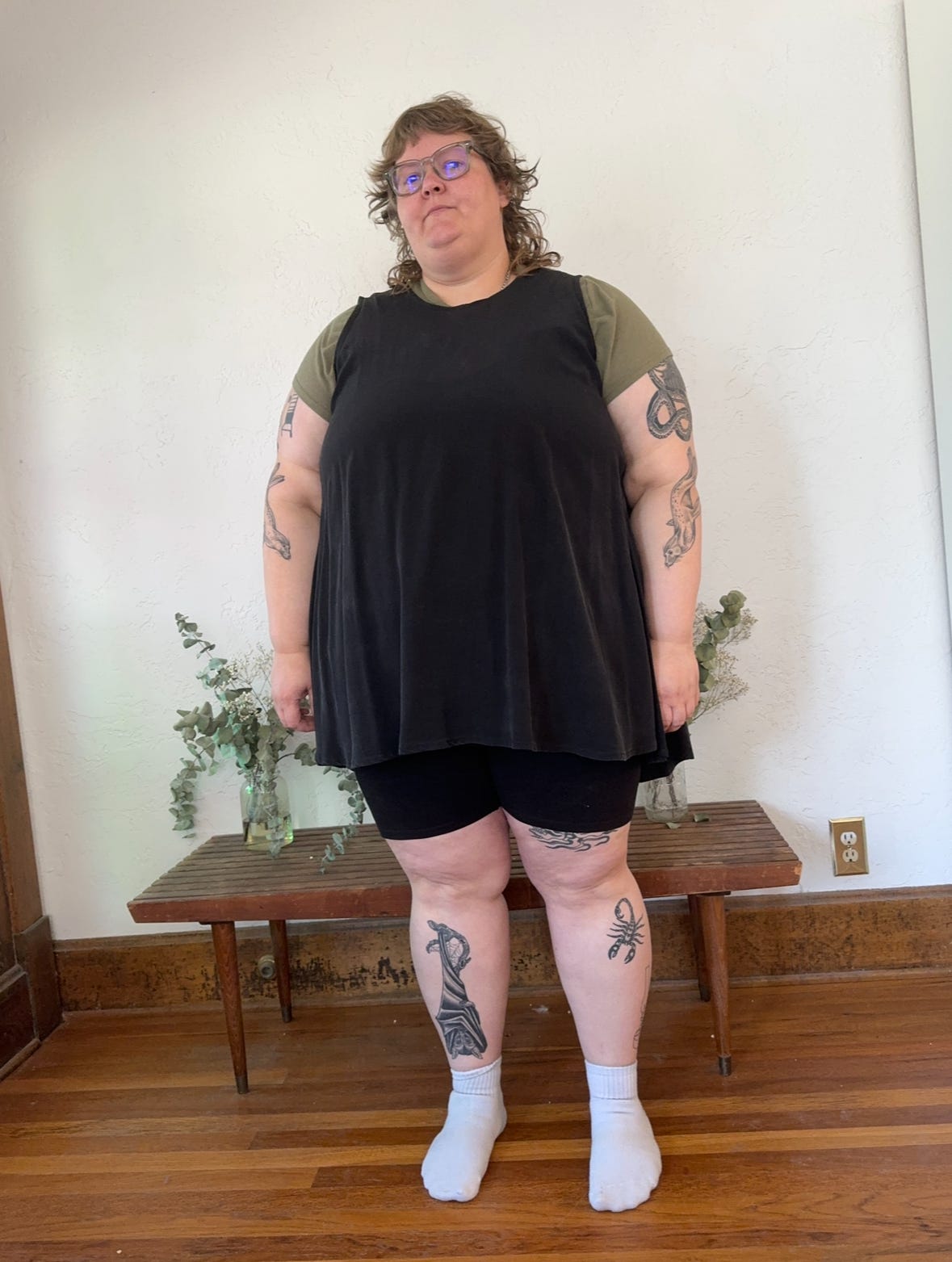 We talked in the first episode about how there is comfort in terms of physical comfort, which might be your sweat pants. But I think both Corinne and I would struggle to wear sweat pants out into the world. There’s the whole visible fat person thing. And so safe and comfortable outfits for those situations might not always be physically comfortable. So I think that tension was something I was thinking through a lot. Like, am I trying to dress for social comfort? Or purely physical comfort? Or can I do both?