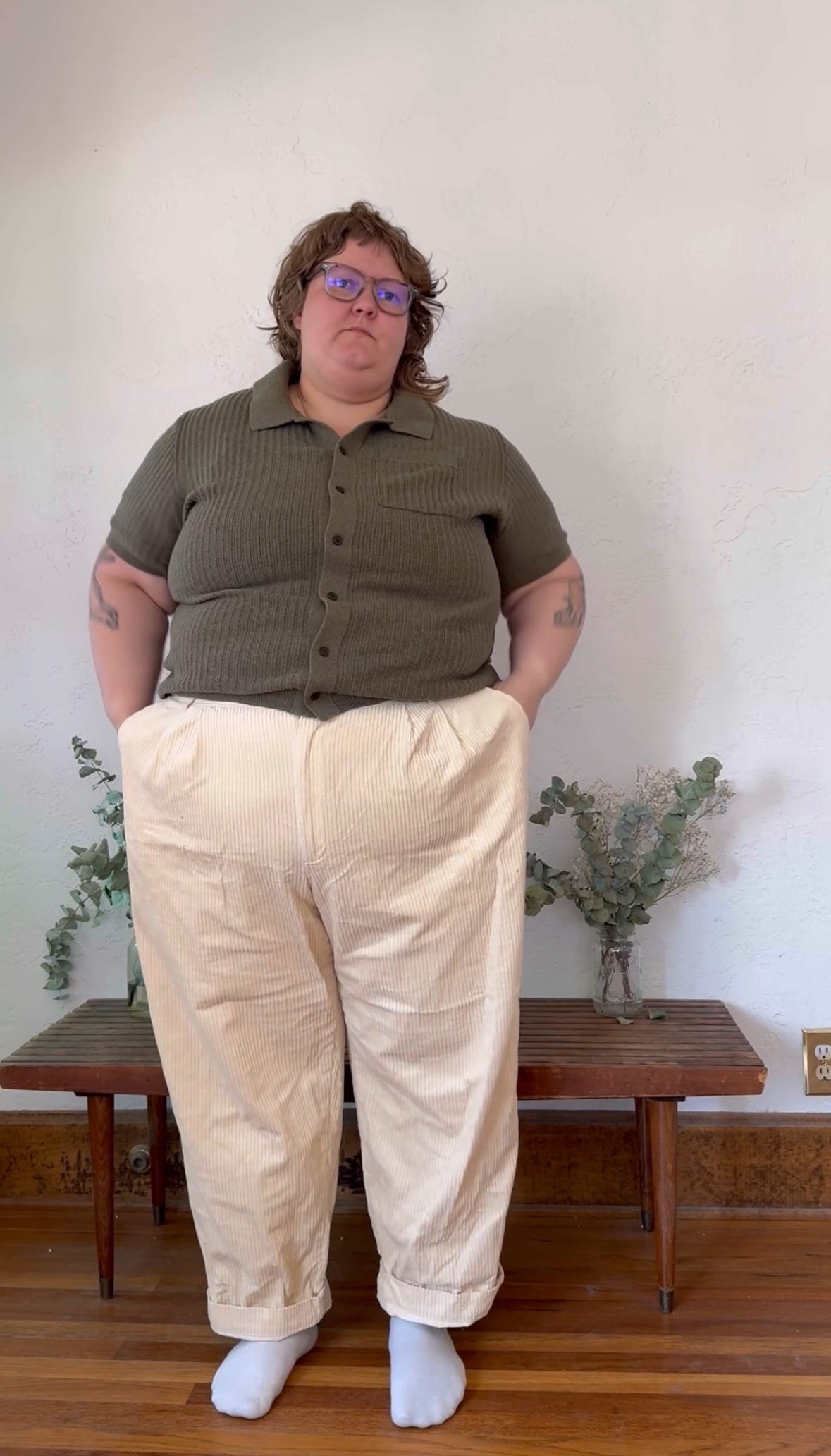 My Butter is this new style of paint well, new within the last year or two, of pants called the barrel pants or the balloon pant or whatever you want to call them. But it has this interesting shape, it almost makes you look bow legged, the style of the pant. I have just liked the uniqueness of it. And the modern newness of it. So I’ve been on a quest to find some that I liked so I tried a bunch on this week. There are some from Anthropologie that I liked that go up to plus and then from Everlane. They go to 2x but I had to size way down in everything I tried. So I would comfortably say that some of the Everlane pairs could go up to a 3x if you’re typical a 3x.