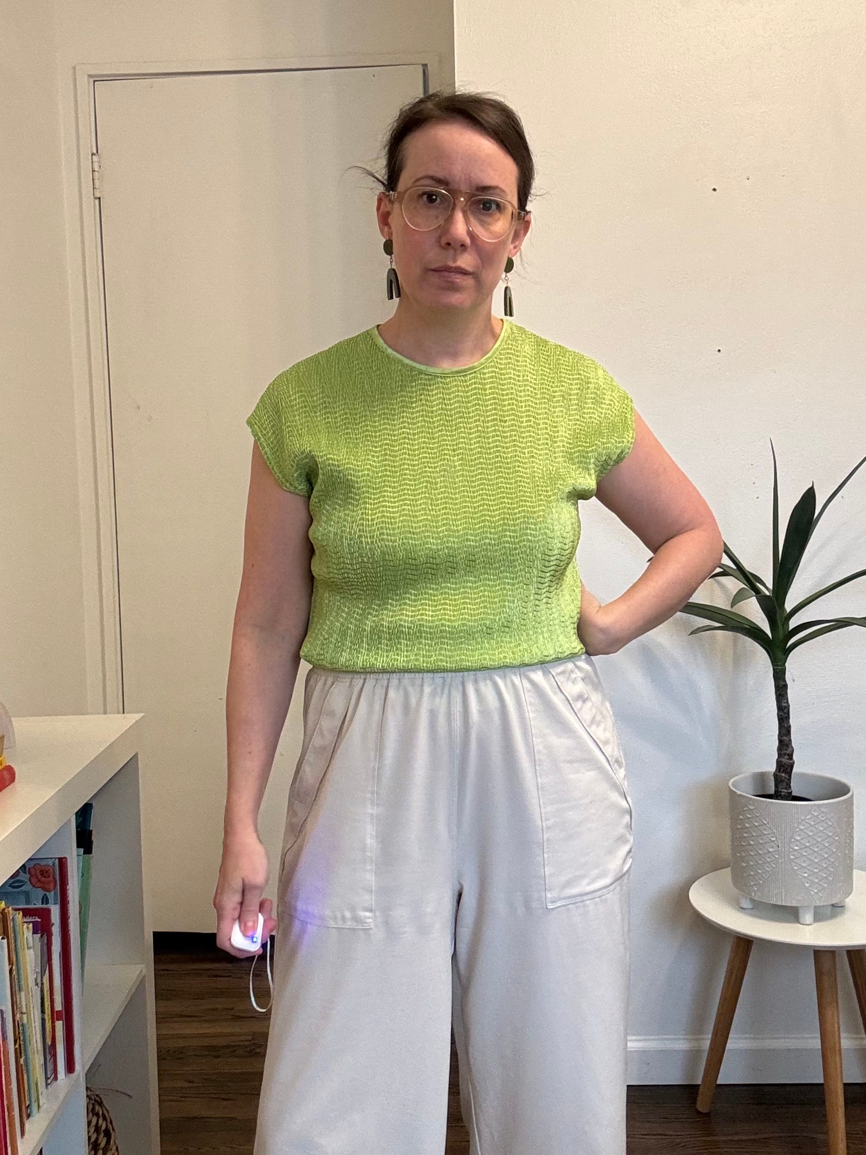 This was also a week where I was very visible on the internet and that was complicated. Then I was like, Oh, I have to go to the school function where I’m going to feel visible in this other way. I felt so good about this outfit because it felt polished, which somehow felt important to me. Like, I couldn’t go to the school event in sweatpants. Not that you can’t, you absolutely can. But that particular week, I felt like I needed a little bit of armor on. But it was also very physically comfortable. Those are my Universal Standard jegging skinny jeans that have an elastic waist. They’re not binding or falling down. They feel good. And I just felt like oh, I threaded a needle here—and I really liked how it looked! I had the pop of color. I had all the things that make me like an outfit. I felt really proud of coming up with that at the end of that particular week.